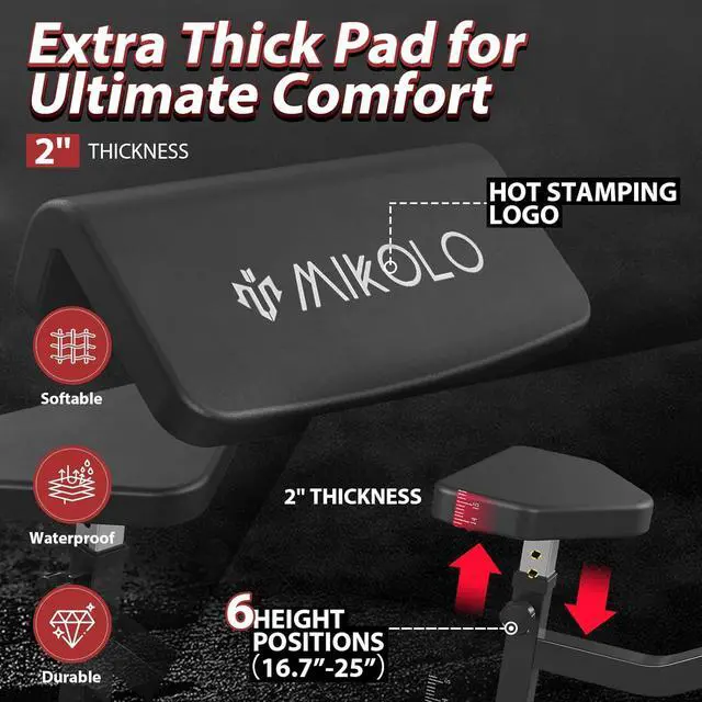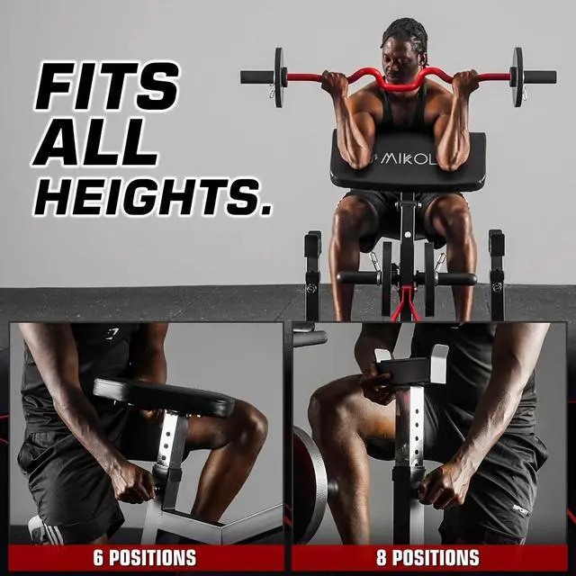 Adjustable Features: Easily customize the seat and preacher pad positions. Wide range of adjustment options, making it suitable for almost any body size. Rack with 8 height settings, with rubberized shelves for free training with barbells or dumbbells.