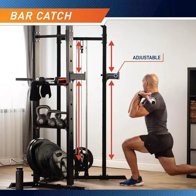 Adjustable Bar Catches: The Marcy Olympic Strength Cage is equipped with commercial-style adjustable bar catches, allowing you to easily switch between bench press and squat exercises for a seamless workout experience. This feature ensures safe and efficient barbell replacements during various movements.