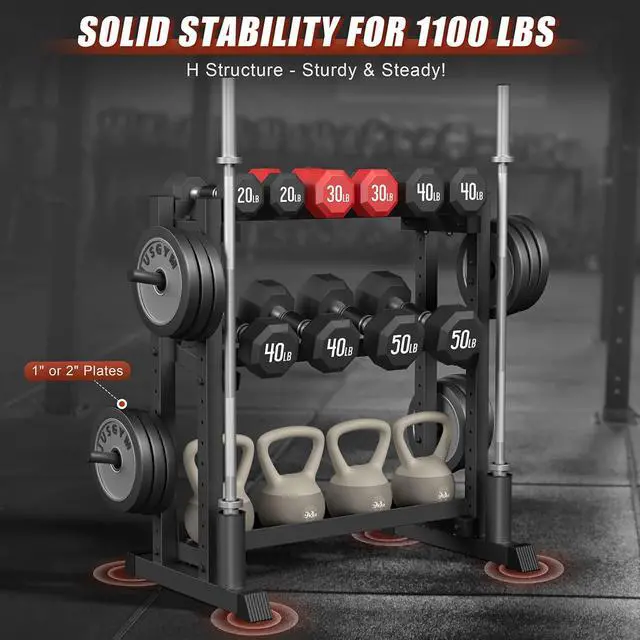 CAPACITY ALL-IN-ONE RACK: This heavy-duty H-frame stand supports dumbbells, kettlebells, barbells, and 1" or 2" weight plates with commercial-grade steel construction. The powder-coated finish resists scratches, rust, and deformation while maintaining stability under extreme loads up to 1100lbs