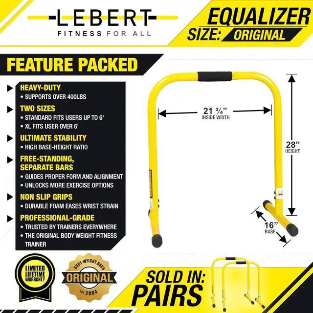 WHATS IN THE BOX Includes 2 EQualizer bars with foam handles, 1 hip resistance band, and access to exercise videos. Bars are 28" tall, 21¾" base, support 400 lbs. Regular Size Yellow EQualizer.