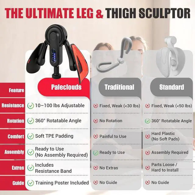 Level Up with this Adjustable Thigh Trainer (10-100 LBs): Unlike generic inner thigh exercisers that pinch, PALECLOUDS features upgraded TPE Pads with an Ergonomic Curved Fit. This thigh exerciser hugs legs securely without pain. The mechanical knob lets you dial in tensionfrom 10 lbs for recovery to 100 lbs for sculptingoffering a professional thigh workout experience that cheap plastic alternatives cannot match.