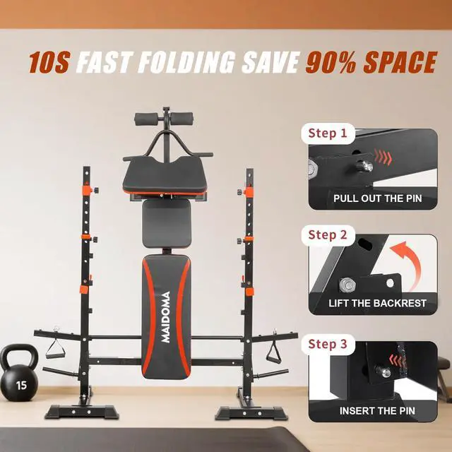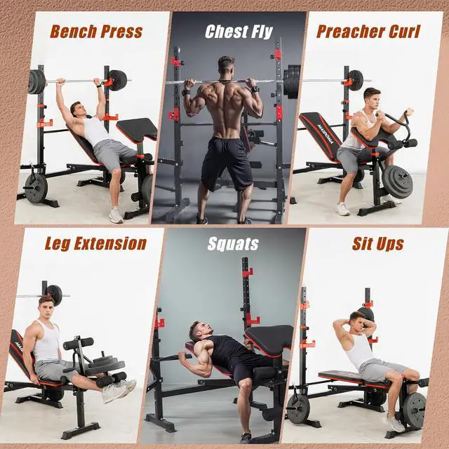 6-in-1 VersatilitySquat stand+weightlifting bench+priest bench+leg trainer+butterfly arm+horn handle 6 in 1, supporting various exercises such as bench press, squat, and two head bending. A set of equipment meets the fitness needs of the whole family, saving space and budget.