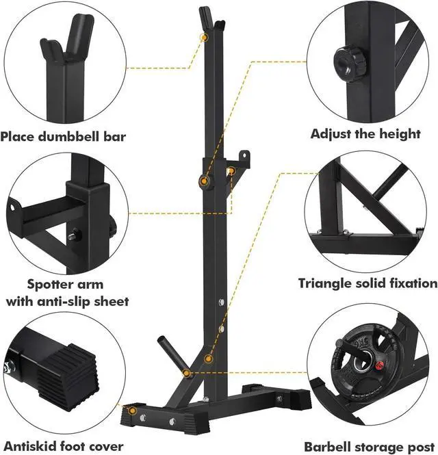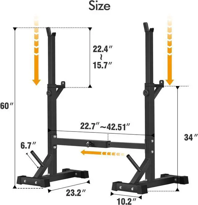 Height Adjustable: Adjustable Barbell Rack that suitable for a variety of height requirement. Bracket Height range of 50 Inch -57 inch, Adjust the spotters to fit your height need.