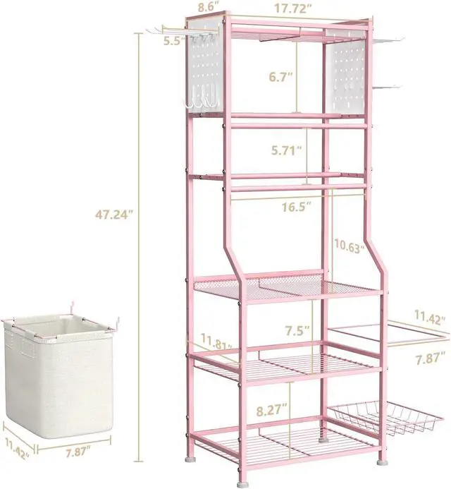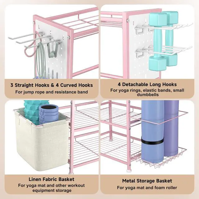 6 Tier Compact Gym Storage Rack: The entire home gym storage rack adopts a compact design with 6-tier shelves, which doesn' t take up a lot of space while allowing for more storage overall. The dimensions of this metal home gym organizer are 11.8 " D x 17.7 " W x 47.2 " H. The side storage basket size is 11.4 x 7.8, side fabric pocket size is 11.4 x 7.8. The straight hooks size is 5.5, the double straight hooks size is 5.3.
