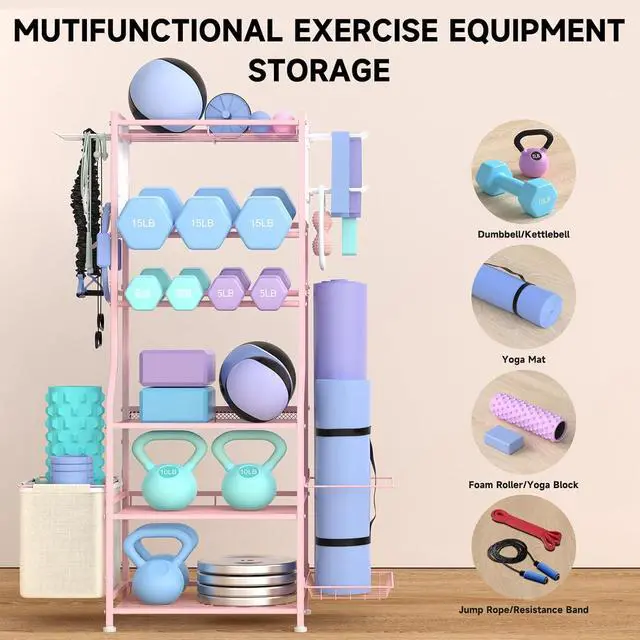 All-in-one Multifunctional Dumbbell Rack: This weight rack features a versatile design that allows it to store various home gym equipment, such as the top plank layer for kettlebells and small balls, the 2-layer weight rack for dumbbells, the bottom 3 tiers storage rack can hold kettlebells, yoga blocks and other exercise equipments, several side storage hangers for storing resistance bands and small dumbbells. Come with a cloth pocket and a basket to hold yoga mats and foam roller.