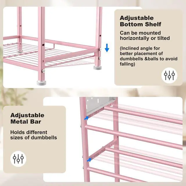 Sturdy Weight Rack for Home Gym: The pink dumbbell stand workout storage is made of high-quality metal materials, carefully processed and designed, it is strong and reliable. The gym storage rack surface is powder-coated to prevent rust and scratches. The adjustable feet balance the dumbbell rack and prevent noise and floor scratches. With a modern simple element for home decor, this dumbbell stand is a functional addition to the home gym.