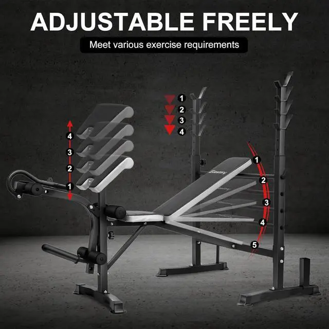 The Weight Bench with 4 adjustable backrest positions, barbell rack preacher curl pad can be both adjusted to 5 different levels. That you can easily adjust to incline, flat and decline positions. You can fully work out your legs, back, chest, abs, shoulders and arms with weight bench.