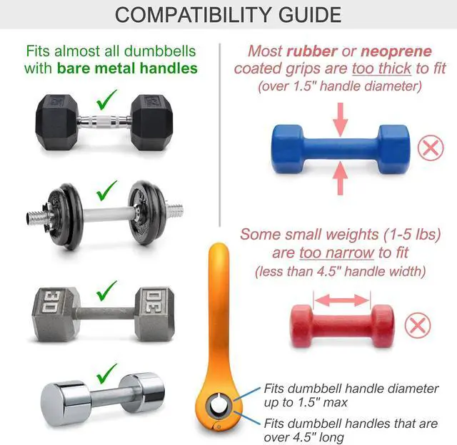 DUMBBELL COMPATIBILITY: Compatible with most adjustable dumbbells and nearly all standard dumbbells with bare metal handles (max 1.5 " handle diameter, min 4.5 " handle length). **Does not fit** most vinyl or neoprene coated dumbbell handles because those are often too thick and/or too short. Please refer to the compatibility graphics.
