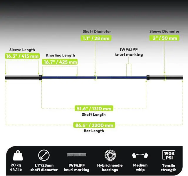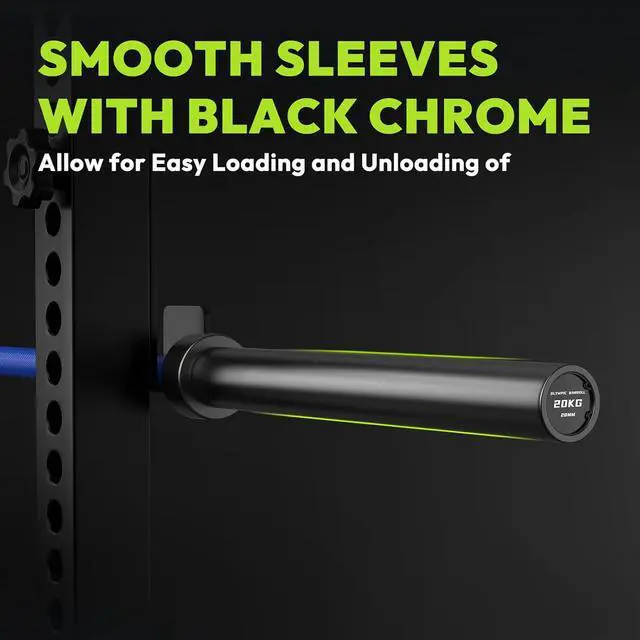 Solid Knurled Grips: The bar features a 1.1 in (28 mm) shaft with professional knurling that ensures a solid grip. Dual knurl markings(IWF&IPF) help you find the right spot on the barbell during workout. The sleeves with smooth chrome e-coating can greatly reduce pressure on your wrists and forearms and make it easy load and unload weights.