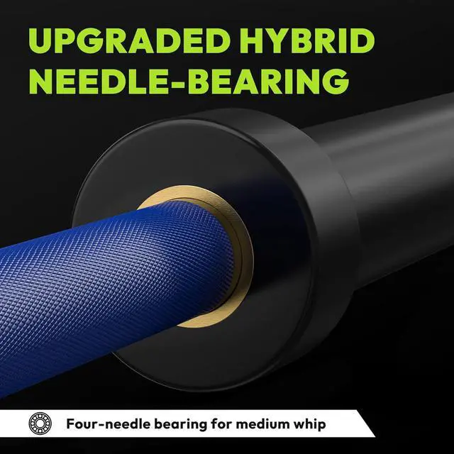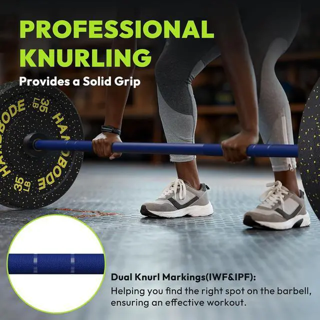 Olympic Barbell: HANDBODE 45 lb (20 kg) Olympic barbell is made of high-quality alloy steel. It' s ideal for intense strength training, delivering an exceptional experience every time. Upgrade hybrid needle-bearing leads to consistent and smooth rotation with added durability, as well as a dampening effect to reduce noise when the barbell is dropped.