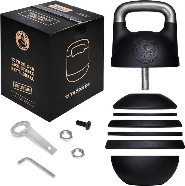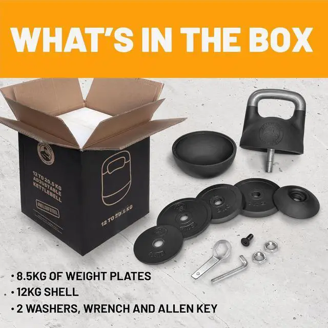 What' s in the Package - The New Bells of Steel Adjustable Kettlebell shell with a smoother and glossier finish; 1x 3kg, 2x 2kg, 1x 1kg & 1x 0.5 kg plates for a total of 20.5 kg. Also includes wrench and nut for adjusting the weight.