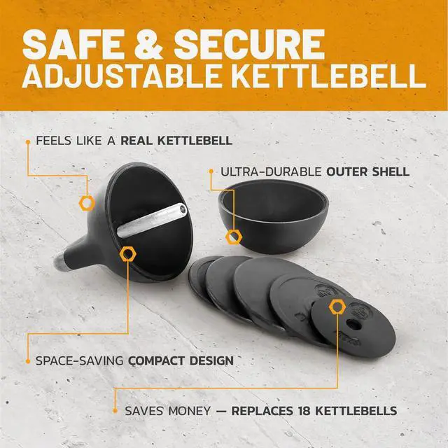 18 Kettlebells in 1 Adjustable kettle bell with unique 0.5 kg and 1kg increments. Same shape as competition kettlebells, perfect for all exercises. Replace clutter with one efficient, space-saving tool.