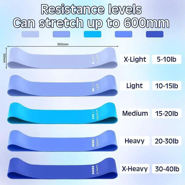Various Size to Meet Divers Needs: each set of the workout bands measure about 600 x 50 mm/ 23.62 x 1.97 inches, and different thicknesses correspond to different weight levels; The thickness of 0.4 mm corresponds to 5-10 lb, 0.5 mm corresponds to 10-15 lb, 0.7 mm corresponds to 15-20 lb, 0.9 mm corresponds to 20-30 lb, and 1.1 mm corresponds to 30-40lb, to satisfy your different exercise requirements