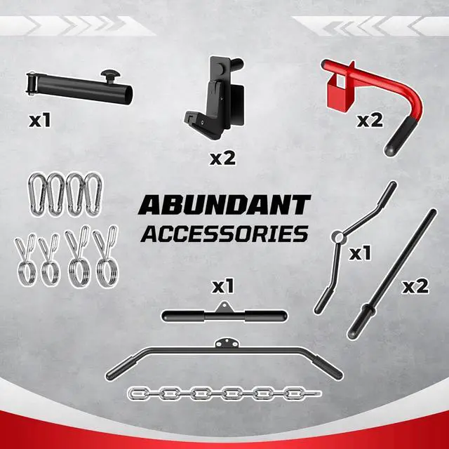 This includes: lat pull-down bar*1, cable bar*1, T-bar*1, pull down bar*1, J-hooks*2, safety rod*2, 360° landmine*1, counterweight racks with clamps*4. Meanwhile, all accessories can be quickly disassembled and installed, allowing you to switch sports modes more conveniently and quickly.