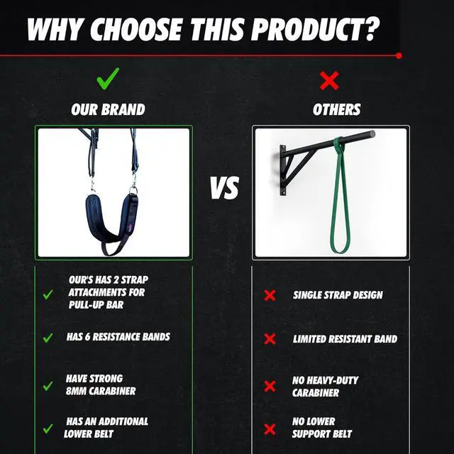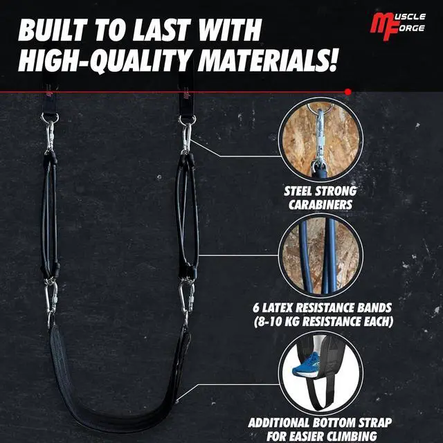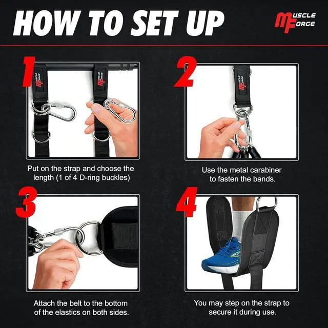 EASY LEG STRAP SETUP Each set includes a wide leg strap that provides stability and comfort during assisted pull ups. Quick-install straps and carabiners fit most pull up bars, so you can focus on your workout without cumbersome equipment