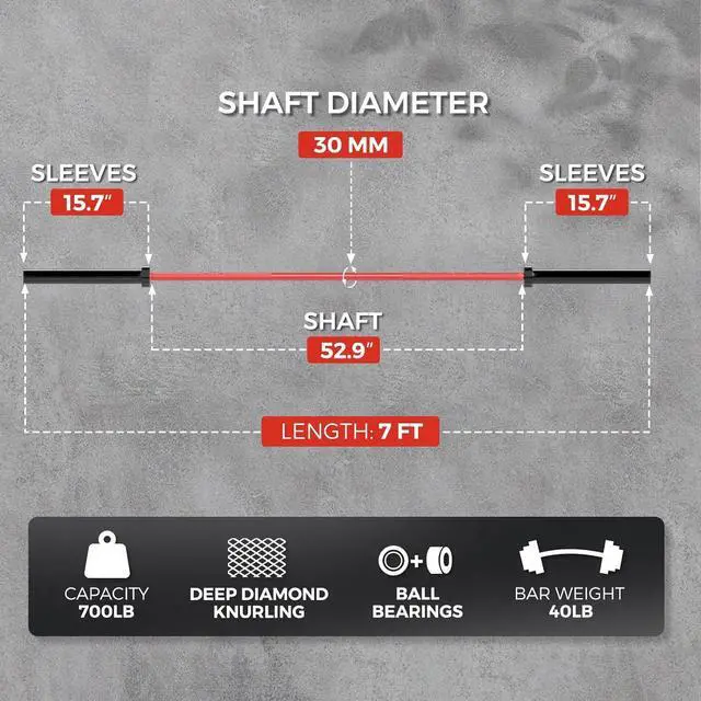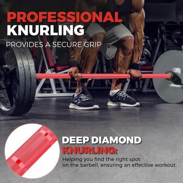 30mm Shaft with Medium Knurl Grip: The ergonomic 30mm Olympic weight bar features medium-depth knurling for a secure, non-slip grip without tearing your hands. Ideal for squat, deadlift, bench press, and heavy strength training workouts.