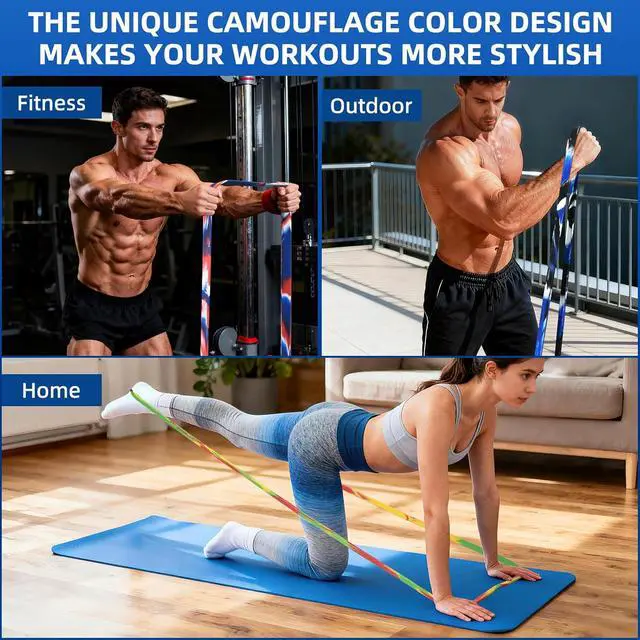 COMPLETE SET WITH CAMO DESIGN: This set includes 3 resistance bands with camo and mixed color patterns yellow-red-green mix, black-white-blue mix, and red-blue-white camo mix. The set also comes with a storage bag and box, forming a full fitness kit for home fitness needs.