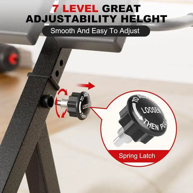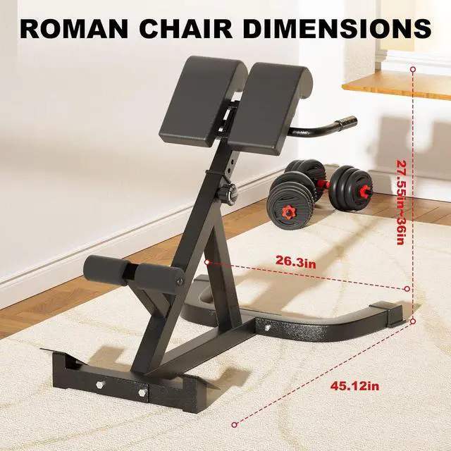 Adjustable height & Save Space: The hyperextension roman chair with 7 adjustable heights to suit all users, The height range of bench is 26.7 in - 37 in, only need to adjust the height to match your exercise needs in seconds with a simple button adjustment