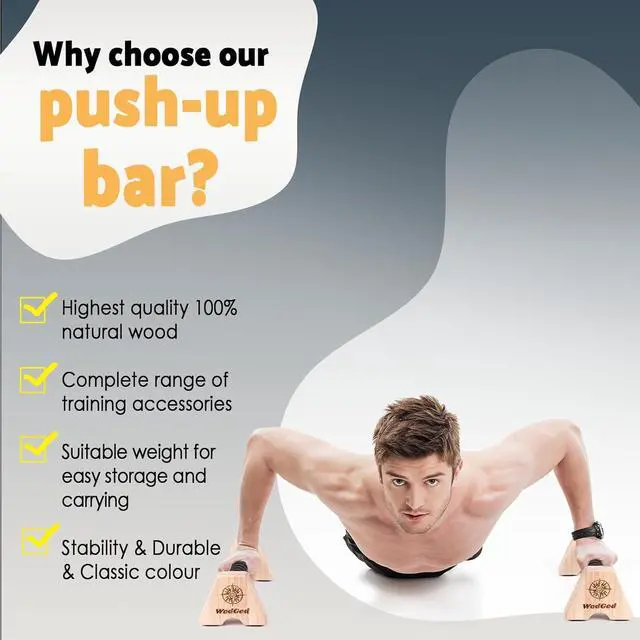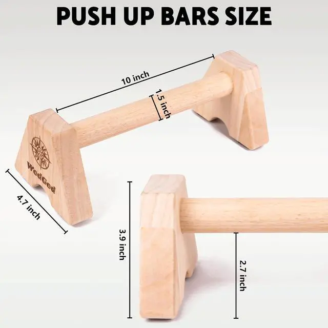High Quality Push Bars SetThis Parallettes Bars are made of high quality solid rubber wood and we have equipped it with a wide range of accessories, including sweatbands*2, wrist guard*2, storage bag*1, velcro strap*1!