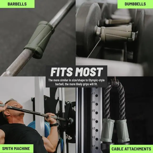 Stays Locked in Place: Made from industrial-strength natural rubber with a non-slip surface; these hand grips for weight lifting fit Olympic bars, dumbbells, cable attachments, and other gym equipment without slipping, rotating, or losing hold mid-lift when appropriate grip force is applied