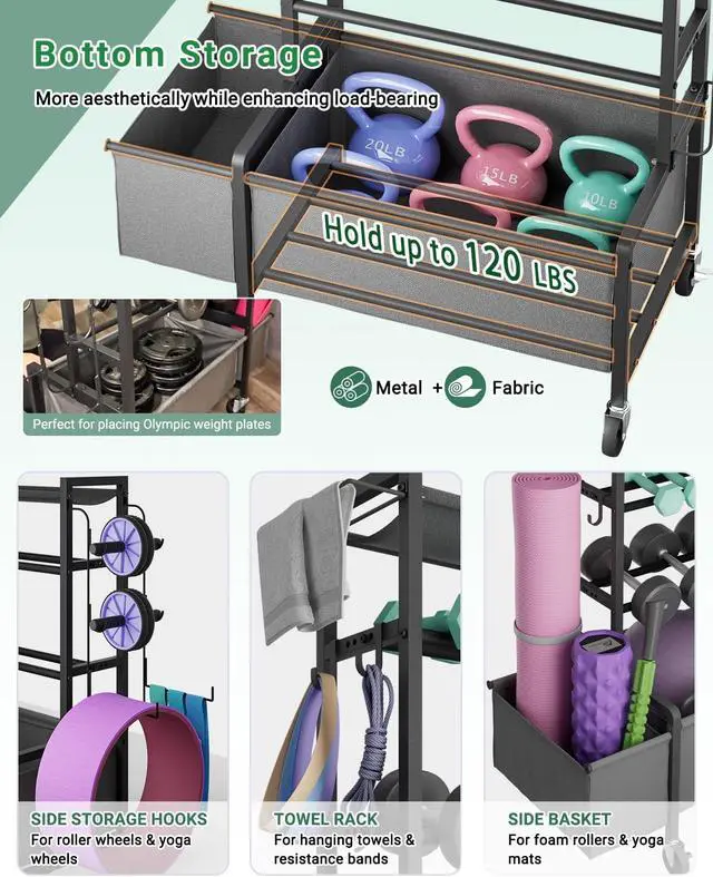 High-Capacity Weight Rack This heavy-duty dumbbell rack and weight rack is constructed with thicker powder-coated steel for anti-rust durability. With an outstanding total capacity of 405 lbs, it delivers reliable support for serious home gym storage and gym equipment storage. The reinforced bottom basket combines metal rods and fabric, holding up to 120 lbs, making it both a functional home gym storage rack and a stylish addition to your space.