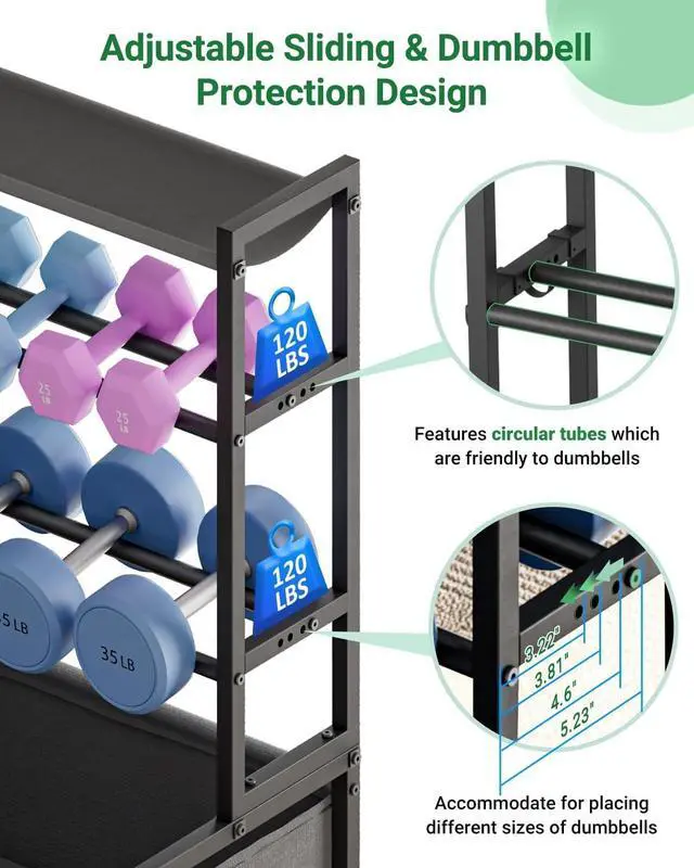 Adjustable Dumbbell Rack for Home Gym This adjustable weight rack for home gym dumbbells features circular protective tubes to prevent scratches. The rack width adjusts to four sizes ( 5.23 " / 4.6 " / 3.81 " / 3.22 " ), fitting various dumbbell sets securely. Each layer supports up to 120 lbs, making it a dependable gym rack organizer for compact or full home gym organizer layouts.