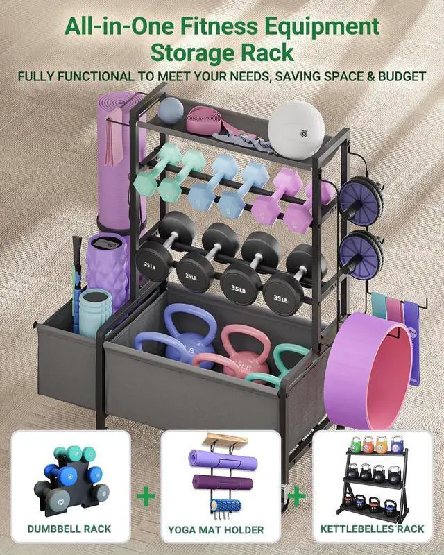 All-in-One Gym Organizer Designed as a complete gym organizer and workout equipment organizer, this gym storage rack features 3-tier racks, 2 fabric baskets, a towel bar, and multiple hooks. It supports efficient gym organization for home gym setups, keeping dumbbells, kettlebells, yoga mats, foam rollers, resistance bands, and accessories neatly arranged and within reach.