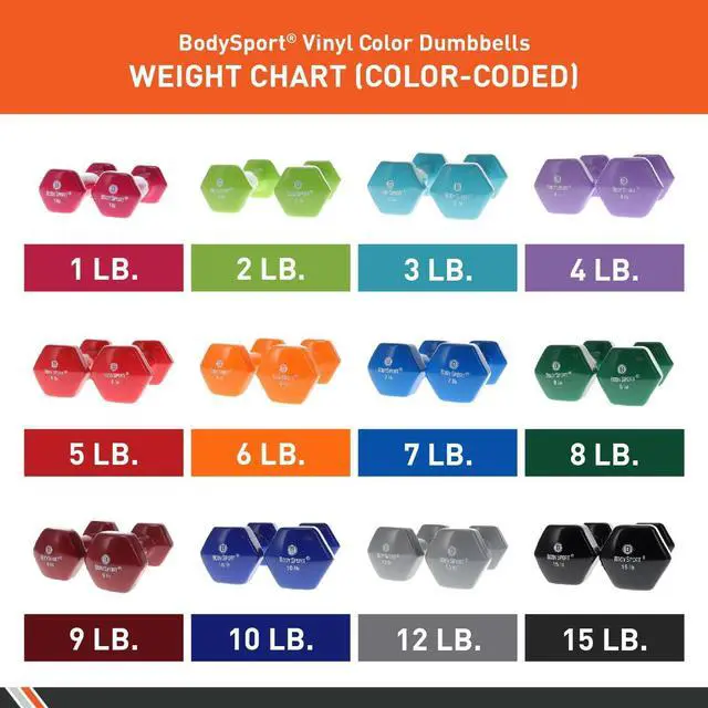 VERSATILE. The Body Sport Vinyl Dumbbell is available in a variety of weight increments, color-coded so its easy to identify which weight you prefer to use.