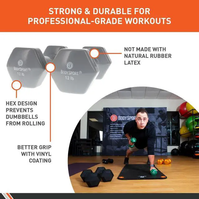 MULTIFUNCTIONAL. This 7-lb. vinyl-coated dumbbell from Body Sport is easy to grip, simple to clean, not made with natural rubber latex, and easy to stack with its hexagonal ends.