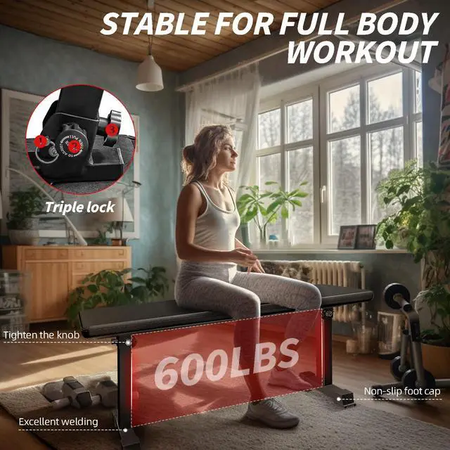 Durable & ComfortableMade of high-quality thick steel, this Houbos Weight Bench can hold over 600 pounds and is durable for years of daily exercise. 2.5 " thick comfortable cushion pad provides consistent comfort and supports your core for your weight set or home dumbbells.