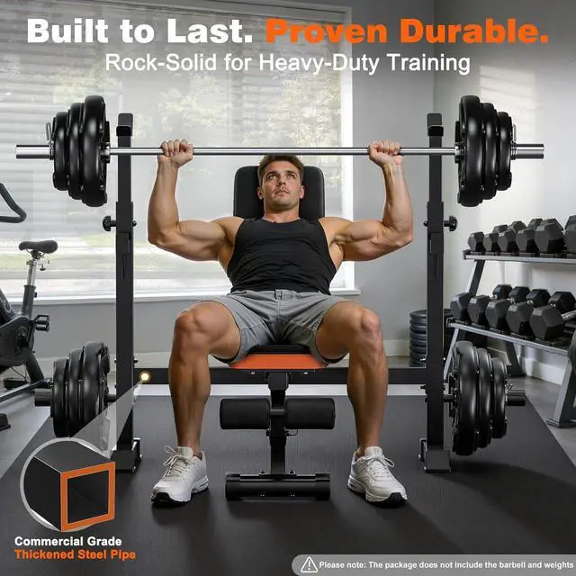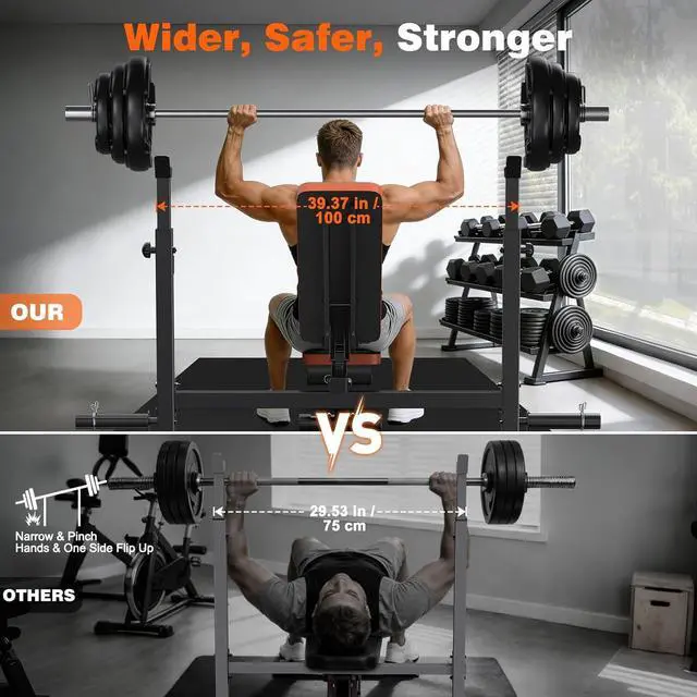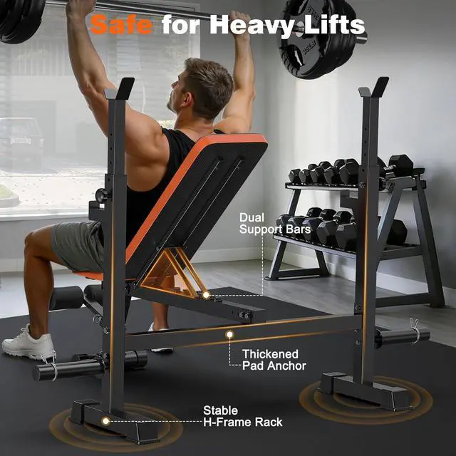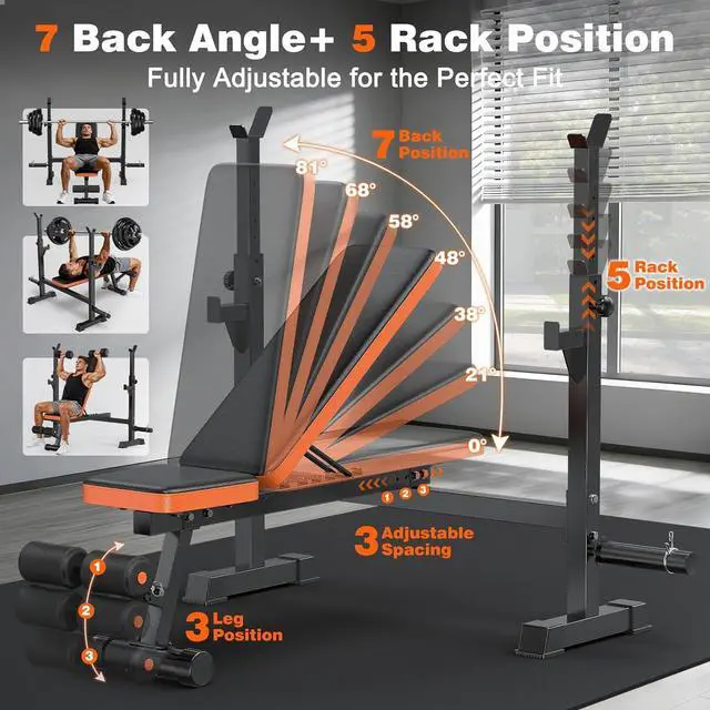 Adjustable Bench PressThe weight benches for home gym has a total of 4 adjustable positions, including 7 backrest positions, 5 barbell rack height adjustments, 3 foot pedal positions, and adjustable distance between the weight bench and the bench press rack. No matter your height, with these adjustable positions, you can find the perfect height for your exercise