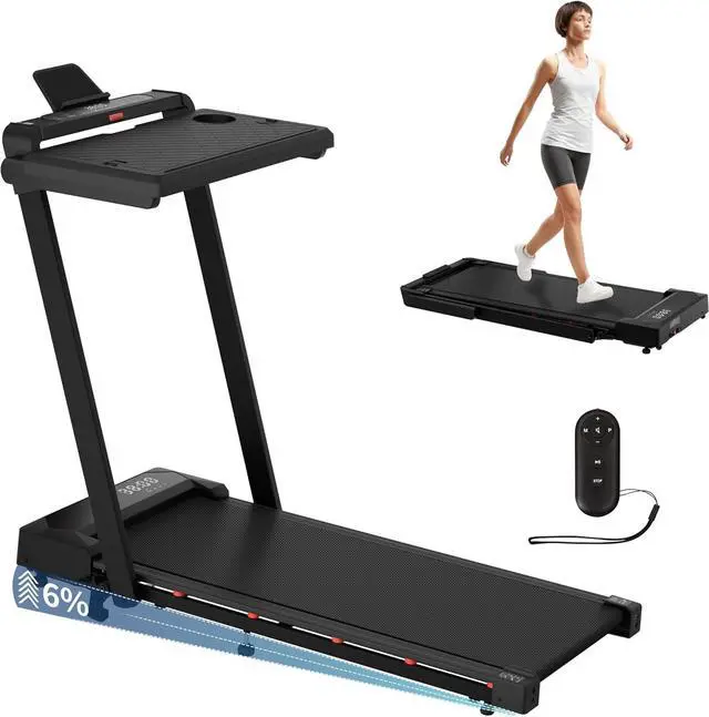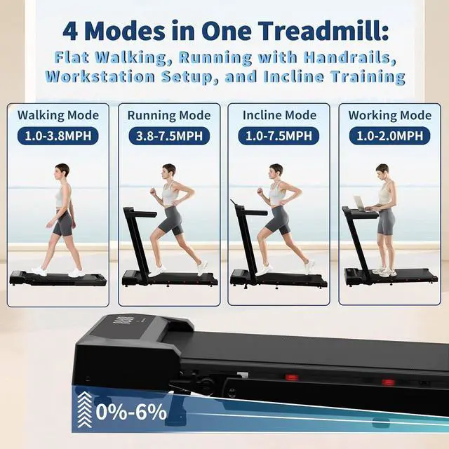 [4-in-1 Walking Pad Treadmill with Incline] This walking pad offers 4 modes to fit your daily routine. Use it as an under desk treadmill for gentle movement while working, switch to treadmill mode for cardio, or adjust the incline walking pad setting to increase intensity and engage more muscles. When extra space is needed, fold it flat and use it as a compact foldable walking pad.
