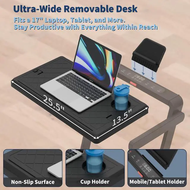 [Removable Desk for Work and Walking] This folding treadmill comes with a removable desk for multitasking. The 25.5 by 13.5 inch surface holds up to a 17 inch laptop, allowing comfortable work while walking. Perfect for walking pad under desk setups, it pairs with the walking pad with handle bar design to create a stable and efficient workspace at home or in the office.