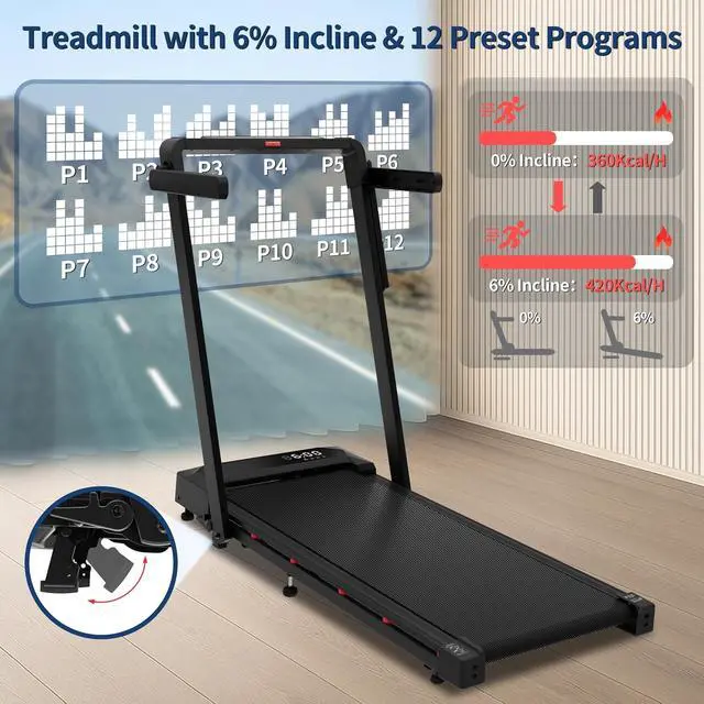 [Treadmill with incline and 12 Preset Programs] This walking pad with incline offers a 6% adjustable slope, simulating an outdoor hiking experience to enhance calorie burn and add variety to workouts. With 12 built-in preset programs, speed automatically adjusts for a balanced mix of low and high intensity, keeping sessions engaging and effective on a small treadmill.
