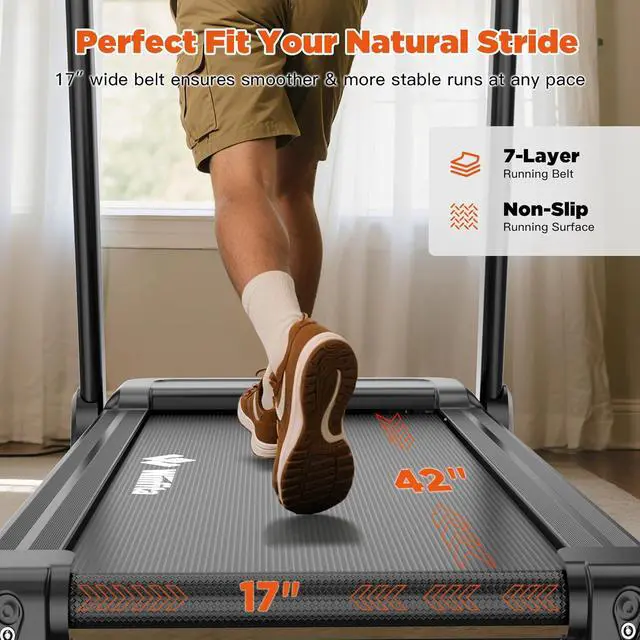 Spacious Running Surface: The 42' ' x 17' ' running belt offers plenty of room for your legs to move comfortably during your workout. Its designed to accommodate your stride effortlessly without worrying about slipping off the track. The durable 7-layer non-slip running belt is built for performance, giving you the freedom to run safely and comfortably.
