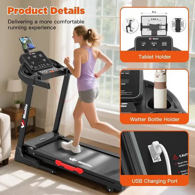 User-friendly Console: The console of the foldable treadmill comes with shortcut buttons for quick adjusting incline and speed, starting, pausing and stopping your workout. The Large 14' ' LED display provides real-time data on speed, incline, time, distance, heart rate, and calories burned. Additional USB charging port, tablet holder and water bottle holders provide more convenience for your training.