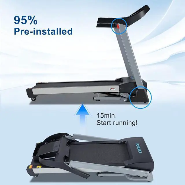 95% Pre-Assembled & Space-Saving DesignOur folding treadmill arrives 95% pre-assembled, it won' t take more than 15 minutes to assemble with only a few basic tools. The transport wheels and soft drop system make it convenient to move or store it at any corner of your room. Perfect treadmill for home use.