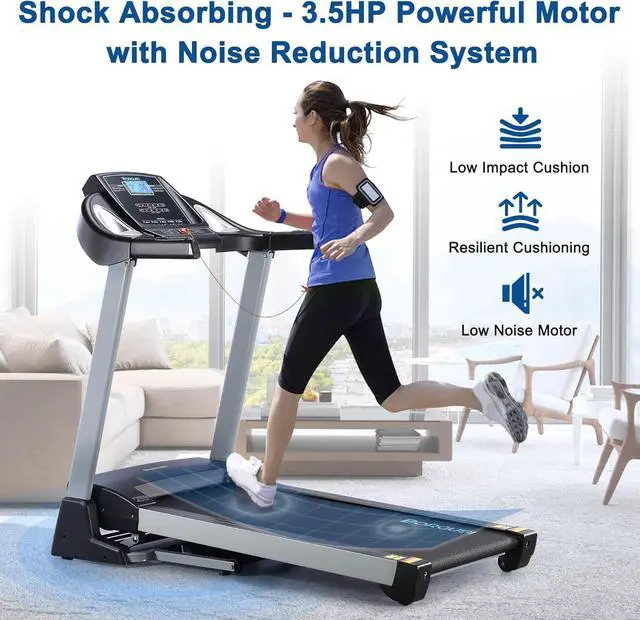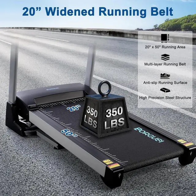 Spacious Running Deck: The 20" x 50" tread belt provides ample space for comfortable jogging or running, while the multi-layer shock-absorbing deck reduces joint impact and noise. Heavy-duty tubular steel construction provides incredible stability. Its weight capacity is 350 lbs.