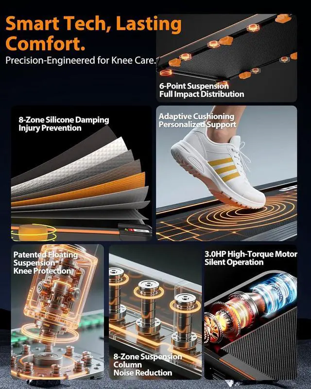 Advanced Cushioning for Joint Protection: Featuring 6 shock absorbers and dual-layer cushioning, these treadmills with incline significantly reduce impact on knees and joints. The system ensures smooth strides and stable footingespecially valuable during treadmill incline traininghelping you train longer with greater comfort and reduced fatigue