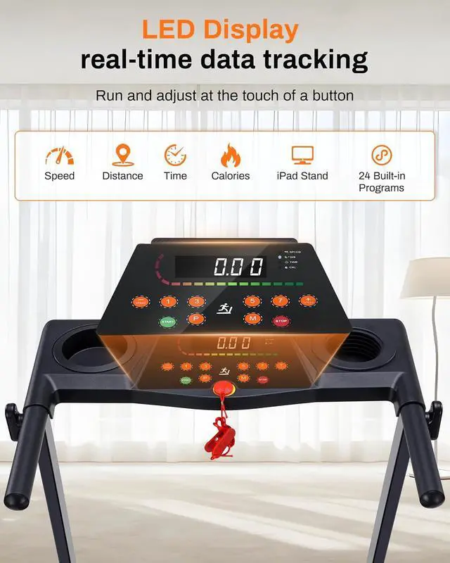 Smart LED Display & Programs: The built-in LED display clearly tracks your time, speed, distance, and calories in real time, keeping all essential workout data at a glance. With 24 preset programs, this treadmill for home offers versatile intensity options to easily adapt to your fitness goals.