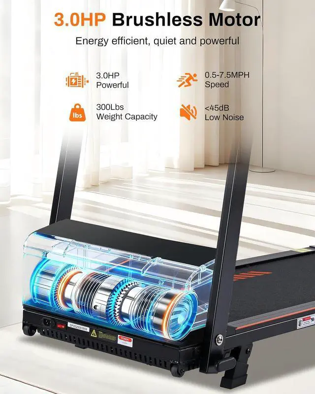 3.0HP Brushless Motor: Engineered with a 3.0HP brushless motor, this walking pad treadmill supports users up to 300 lbs and delivers smooth speeds from 0.5 to 7.5 MPH. Advanced noise reduction technology keeps operational volume below 45 dB, making it ideal for home or office use without disturbing others.
