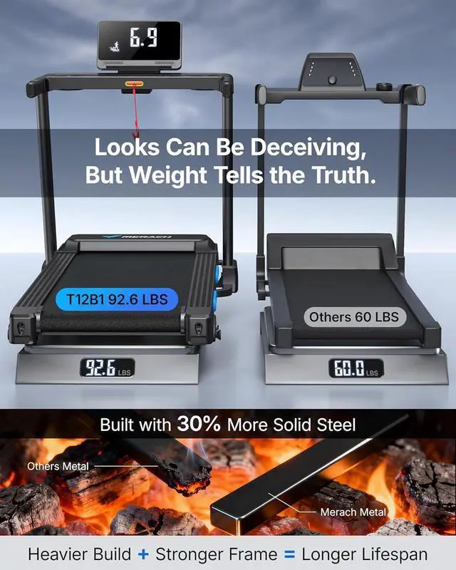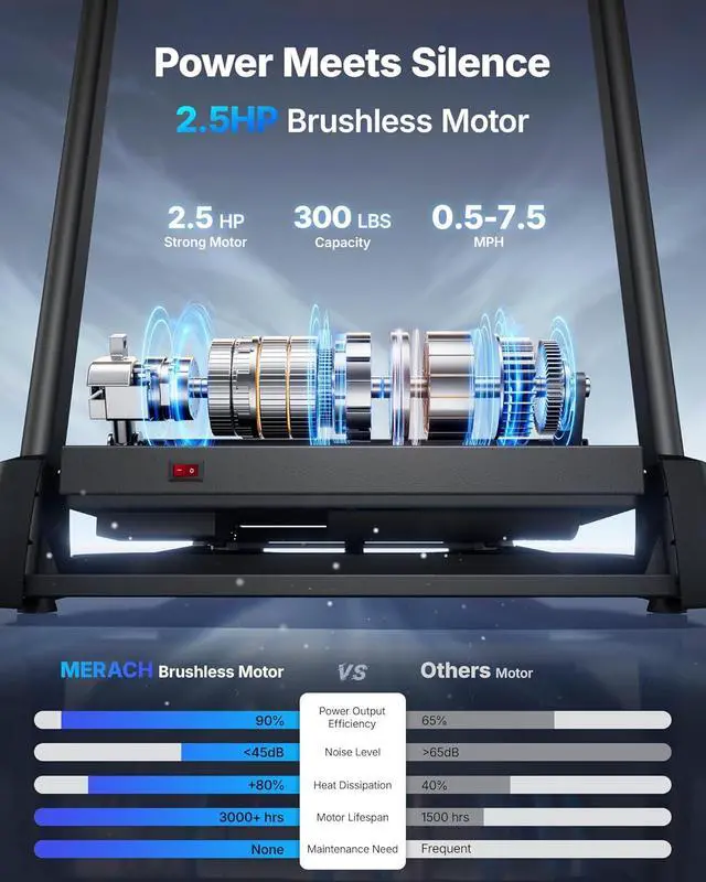 Engineered for Quiet & Durable Performance Powered by a 2.5 HP powerful and quiet mo tor, the MERACH compact treadmill delivers stronger, smoother, and quieter performance ( <40 dB) compared to ordinary treadmills. The advanced motor design reduces heat, prevents belt slippage, and extends lifespanbuilt for years of reliable workouts at home.