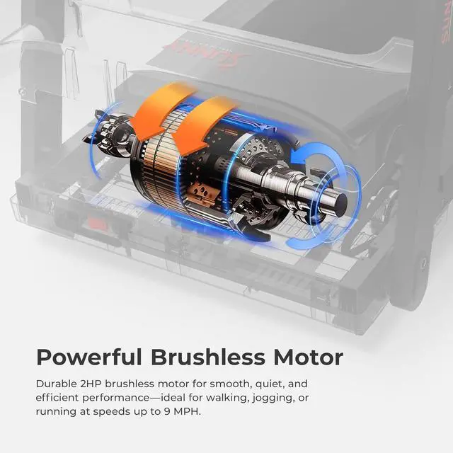 Powerful 2HP Brushless Motor: Experience smooth, quiet, and efficient performance with a durable brushless motor. Designed for walking, jogging, and running, it supports speeds from 1 to 9 MPH for reliable workouts at any intensity