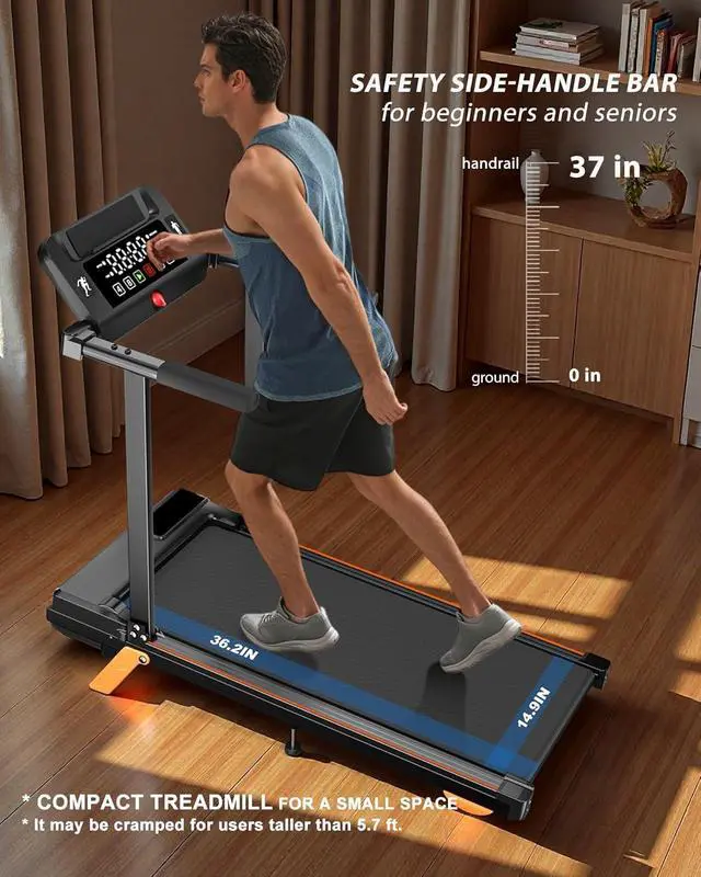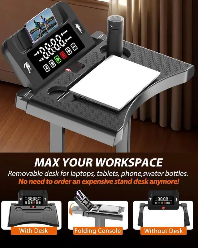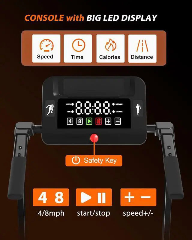 ***Upgrade 4 - Control Way from bar button to Bigger Console The convenient console with a Big LED Display is perfect for seniors, and it features speed+/-, incline+/-, start/stop, and a 4/8MPH shortcut button for easy execution of your training plans. Furthermore, the console folds back 45° to be flush with your desk, further expanding your workspace