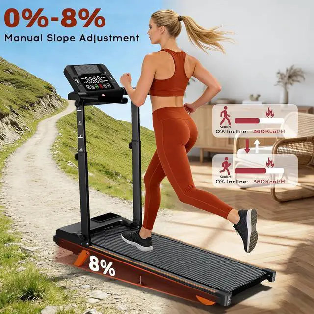 Anti-Slip & Double buffer Shock-Absorbing DesignThe foldable treadmill with incline provides a 37' ' x16' ' spacious running area with 7 layers of anti-slip tough rhombus running belt, plus built-in 6 silicone shock absorbers and 2 soft rubber pads, which provides an effective and safe cushion for your knees and muscles to enjoy a superior running experience. Treadmill with handle bar can give support and security during workouts.