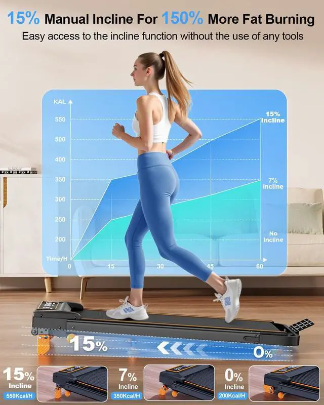 Effective Calorie-Burning WorkoutUnlike ordinary walking treadmill, the walking pad with incline offers 3 quick-adjust levels (0-6%-12%), allowing you to enjoy the experience of hiking and mountain climbing at home. This increased incline helps activate more muscle groups and can boost fitness and fat-burning efficiency by up to 150%, making every step more effective.