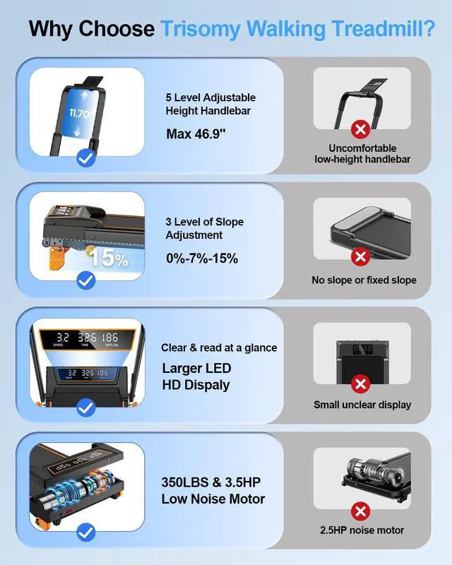 Adjustable Handle Bar Real Family ComfortWe understand how frastrating it can be when the handlebar is too lowback and waist pain, and the whole workout feels tiring. To truly solve this problem, we designed this walking pad treadmill with a 6-level adjustable handlebar (35" 47" ) to accommodate users of varying heights and exercise preferences. Like a supportive hand guiding you into a more comfortable, natural workout, truly bringing comfort and convenience to the whole family.