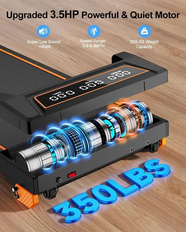 3.5HP Powerful Quiet MotorEngineered for results, this upgraded 3.5HP portable treadmill supports up to 350LBS and delivers steady speeds up to 6 MPH. The foldable walking pad provides smooth runs while keeping noise below 40 dB. Its powerful yet quiet motor makes it ideal for apartment or office use without disturbing others.