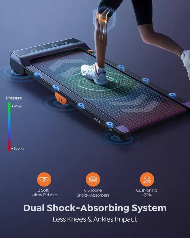 Dual Shock Absorption & SilentCompared with regular treadmills for home, our walking treadmill is equipped with 2 thickened soft rubbers, 8 silicone shock-absorbers and 2.5HP noise-reduction motor, which aims to minimize noise, reduce impact on the knee & ankle and provide a smooth & comfortable experience. You can exercise anywhere without worrying about disturbing yourself or others.