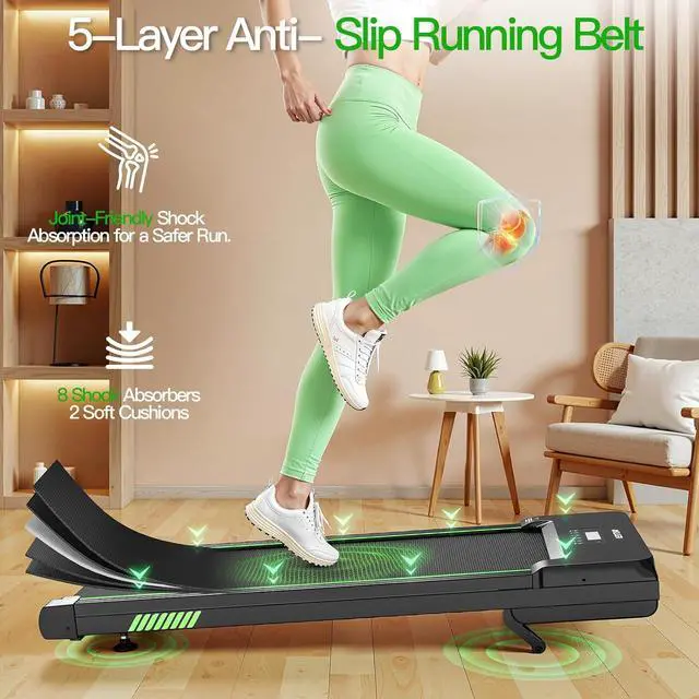 Triple Cushioned Structure Design Protect Your KneesExperience superior comfort and joint protection with our triple-cushion system. It combines a double-deck frame, eight silicone shock absorbers, and a five-layer non-slip belt to absorb up to 40% more impact on knees, ankles, and back compared to standard treadmillsevery step feels smooth and supported.